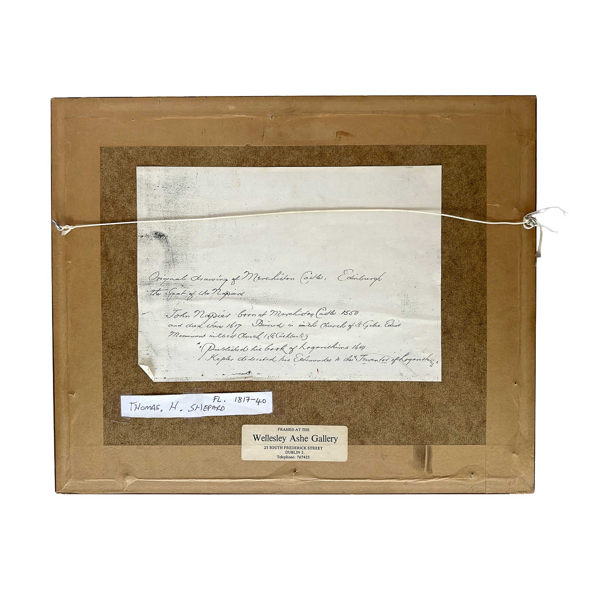 This finely rendered drawing is attributed to Thomas H. Shepherd (active 1817–1840), an English topographical artist celebrated for his architectural views of Edinburgh and London. Executed with delicate wash and fine architectural detail, the work captures Merchiston Castle before its later Victorian alterations.