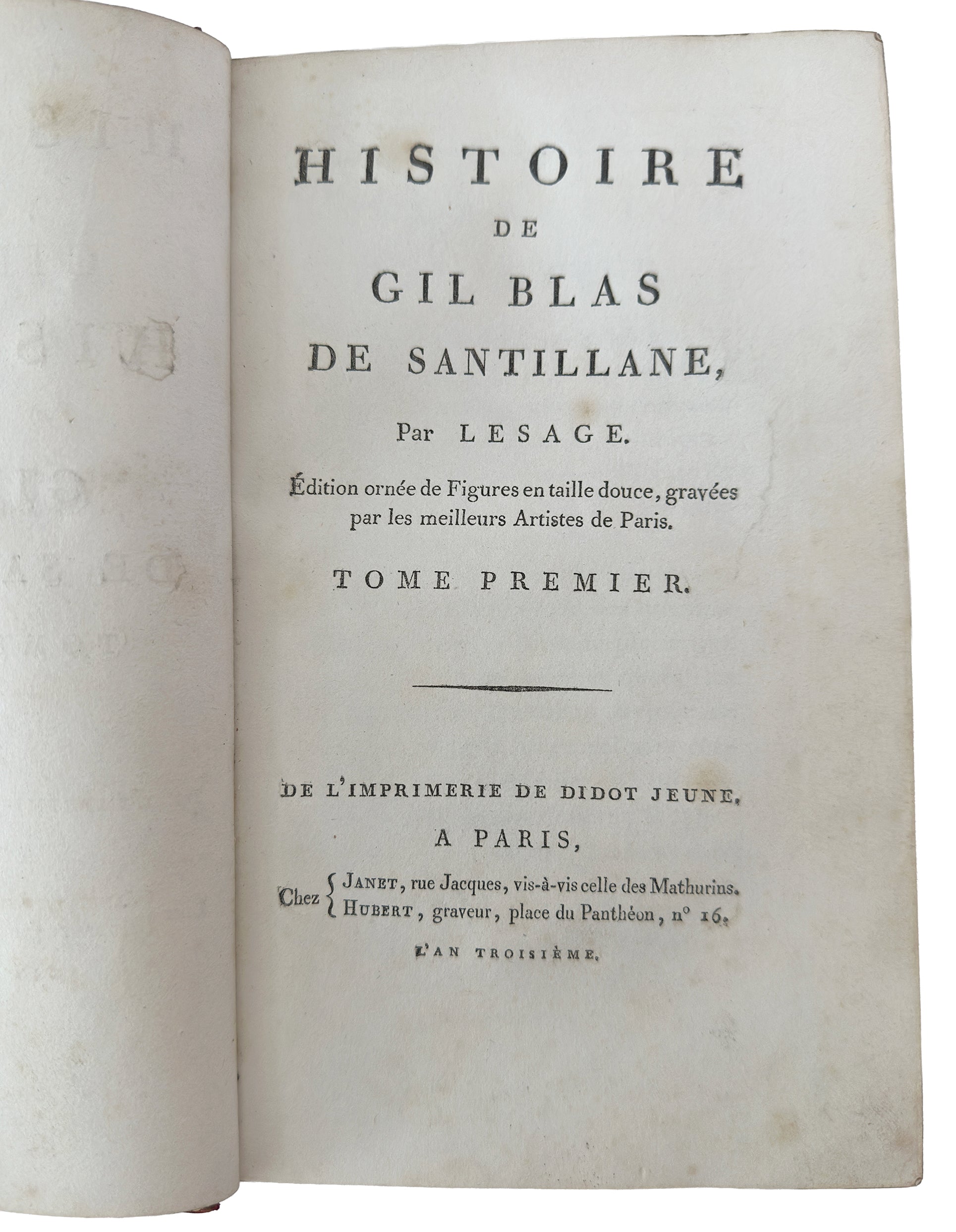 A beautifully preserved and complete late 18th century French edition of Gil Blas, printed in Paris by the renowned Didot Jeune press, one of the most respected names in French Enlightenment-era publishing.