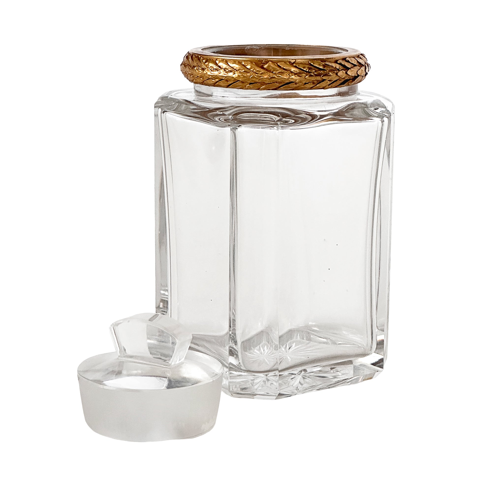 A striking early 20th century cut crystal jar featuring deeply carved panels and a radiant starburst base, finished with an exceptional gilt bronze laurel wreath mount and original frosted lid.