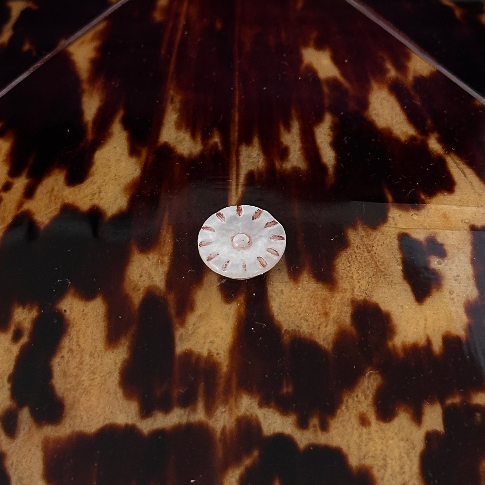 An exceptional early 19th century tea caddy, richly veneered in luminous tortoiseshell and adorned with finely cut mother of pearl panels across the facade and lid. The form is architectural and sculptural, with a stepped top and softly contoured bombe shape that reflects the refined design sensibilities of the Georgian period.