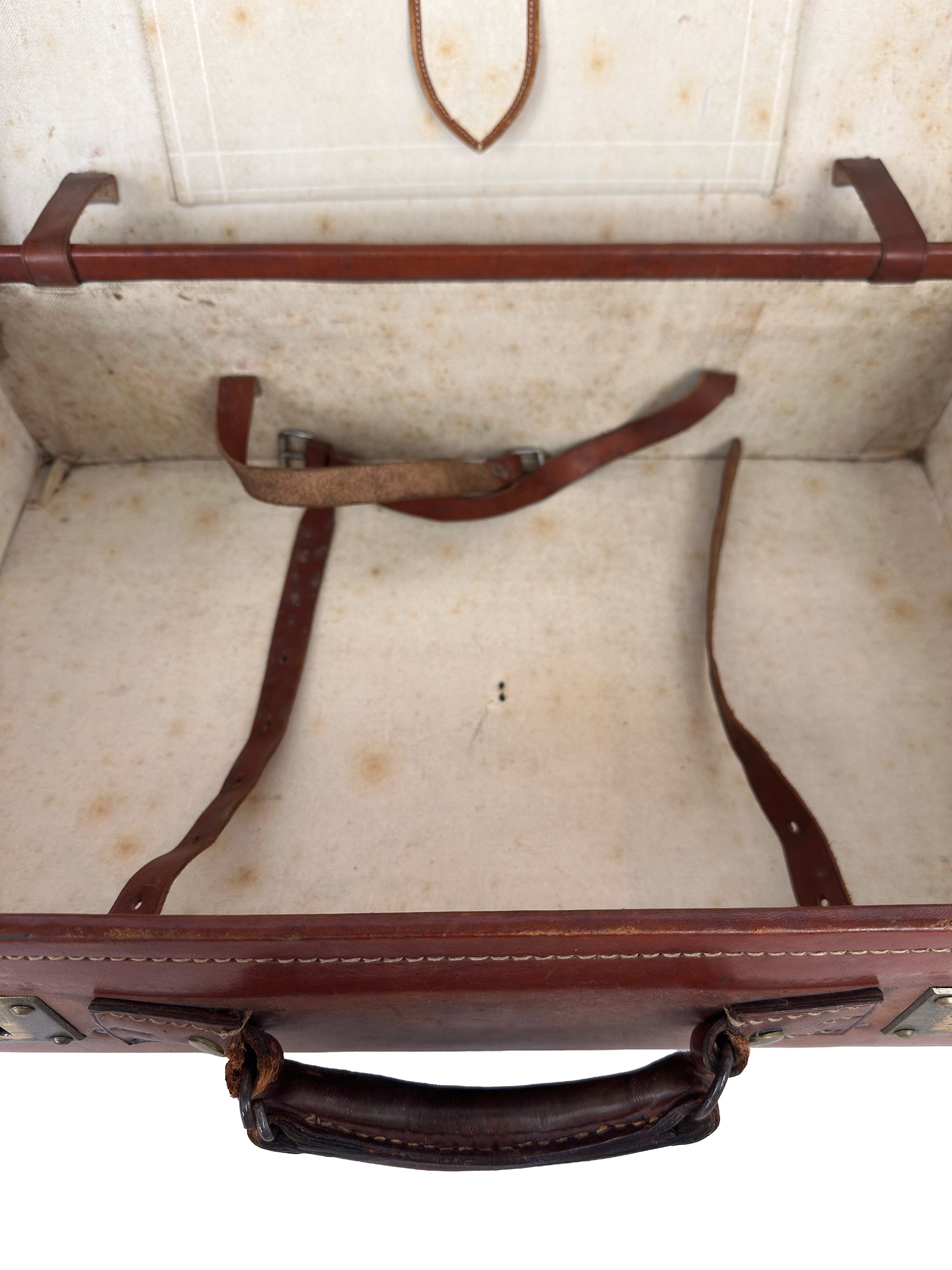 Constructed from thick, vegetable tanned leather with hand stitching, reinforced corner guards, and riveted construction, this case was built for the realities of long distance rail and steamship journeys. The surface shows a rich, naturally developed patina with scuffs and wear that tell the story of real Continental travel rather than decorative aging.