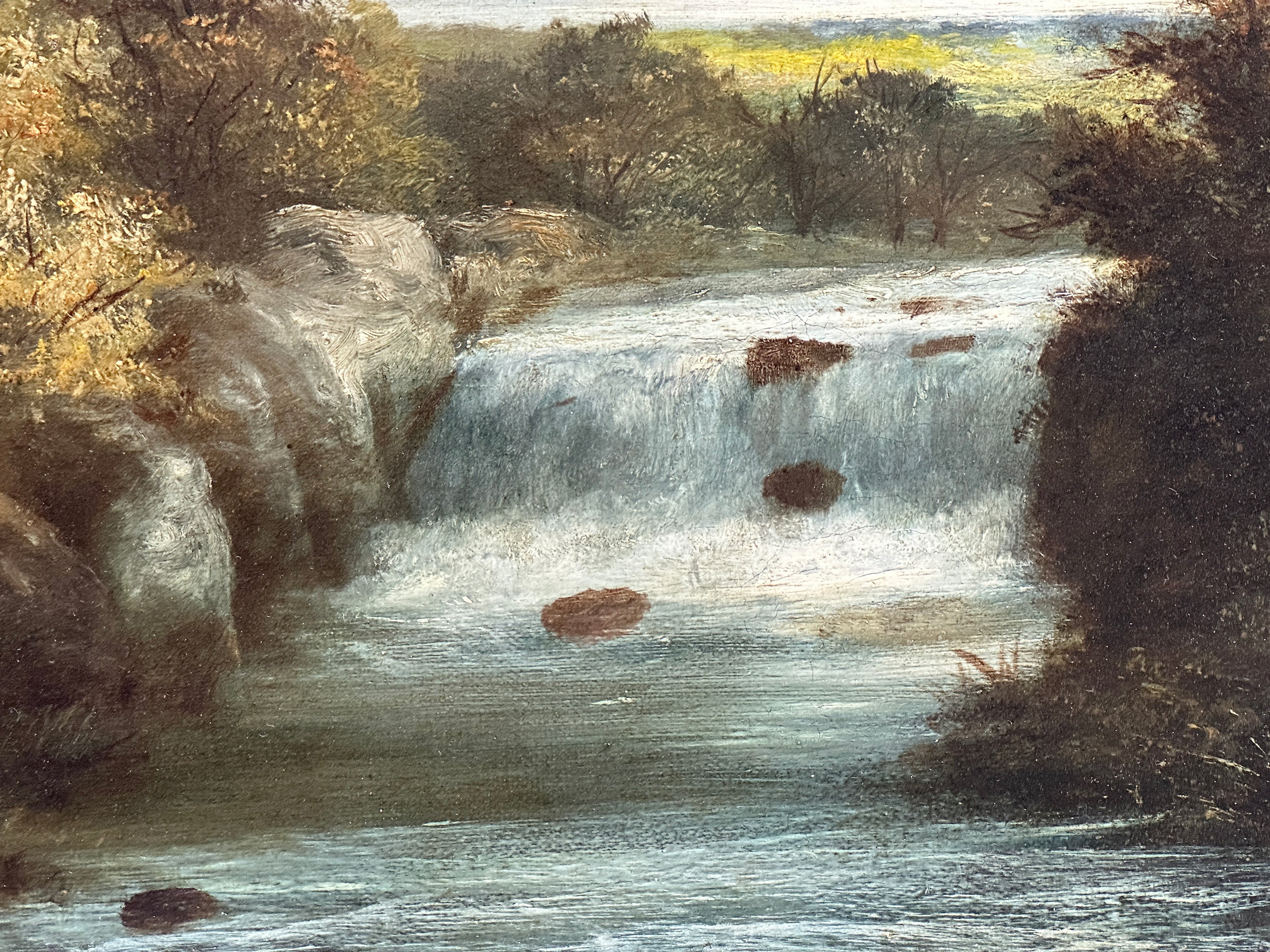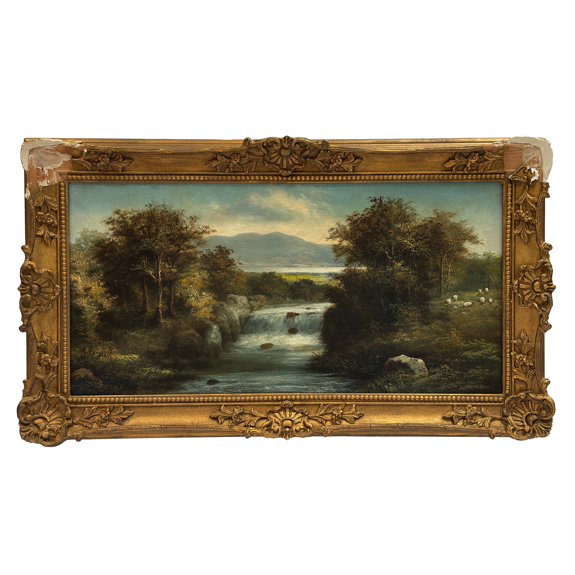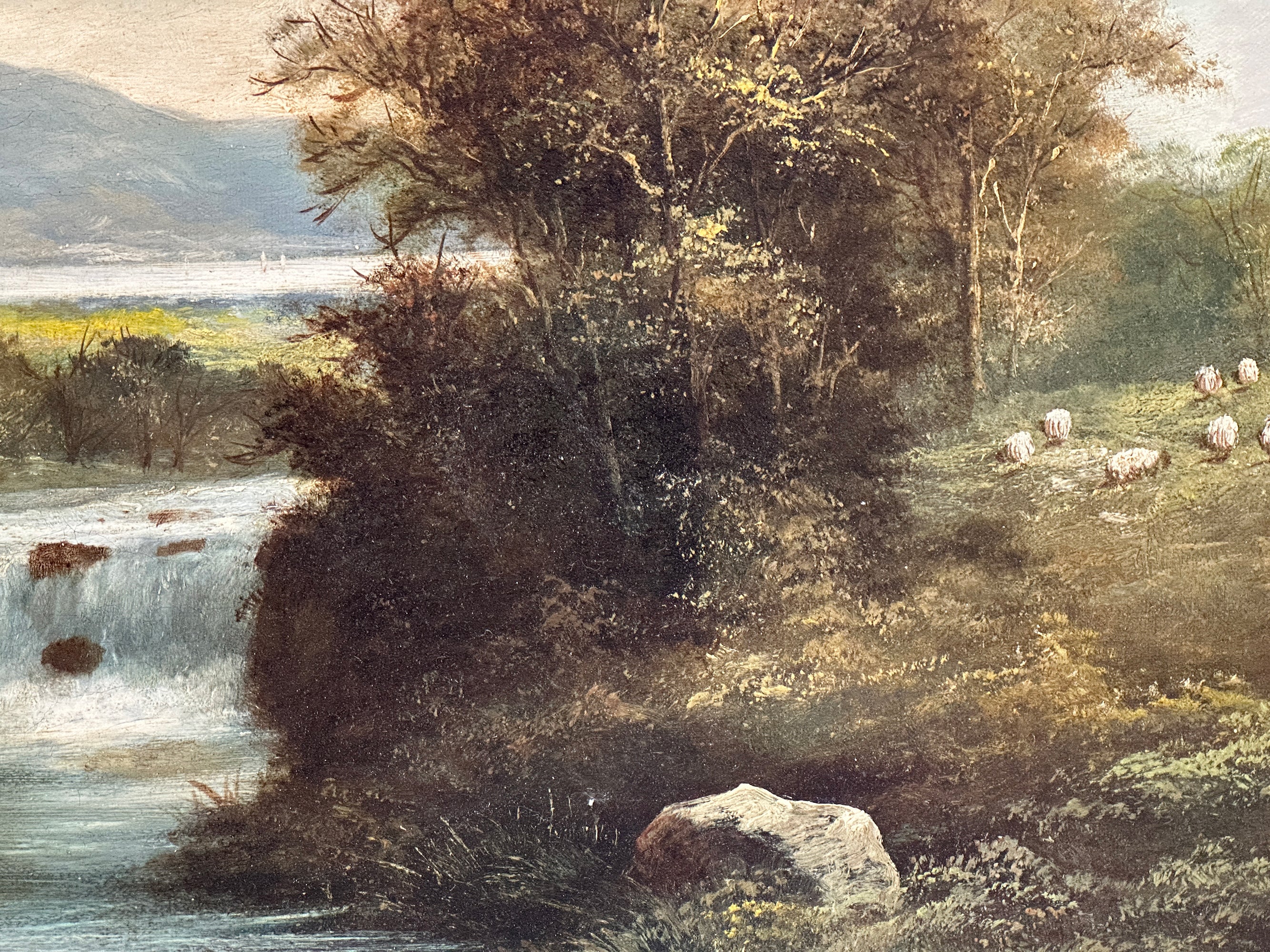 The painting has that classic late 19th century English landscape feel, balancing realism with a slightly romanticized view of nature. The trees are richly worked with soft, textured foliage, while the water is handled with movement and light, giving the scene a gentle sense of life. The sheep add a quiet narrative element, grounding the piece in the rhythms of rural life.