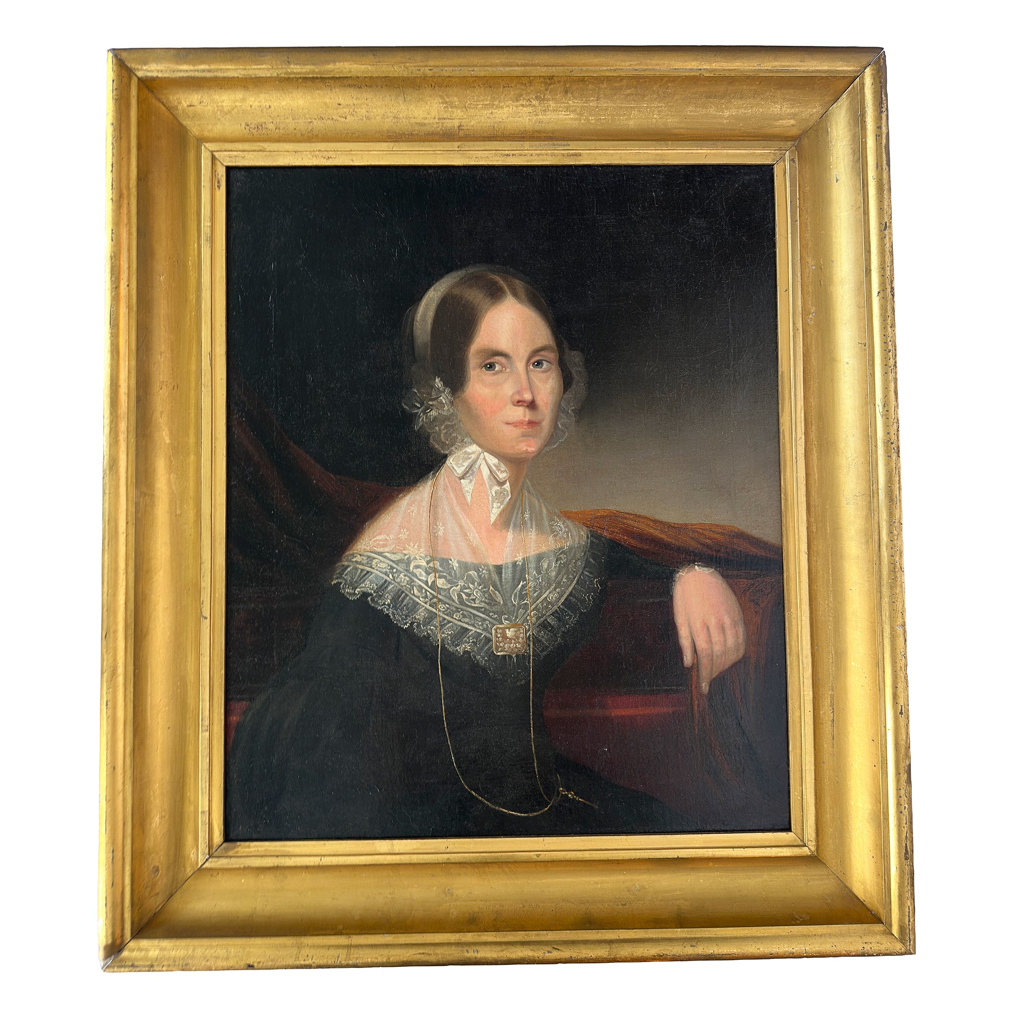 A beautifully preserved mid-19th century American School portrait depicting a refined lady seated in a dignified three-quarter pose. Painted between 1840–1860, this oil on canvas captures the quiet strength, modesty, and cultivated refinement that characterized American portraiture in the decades before photography became widespread.