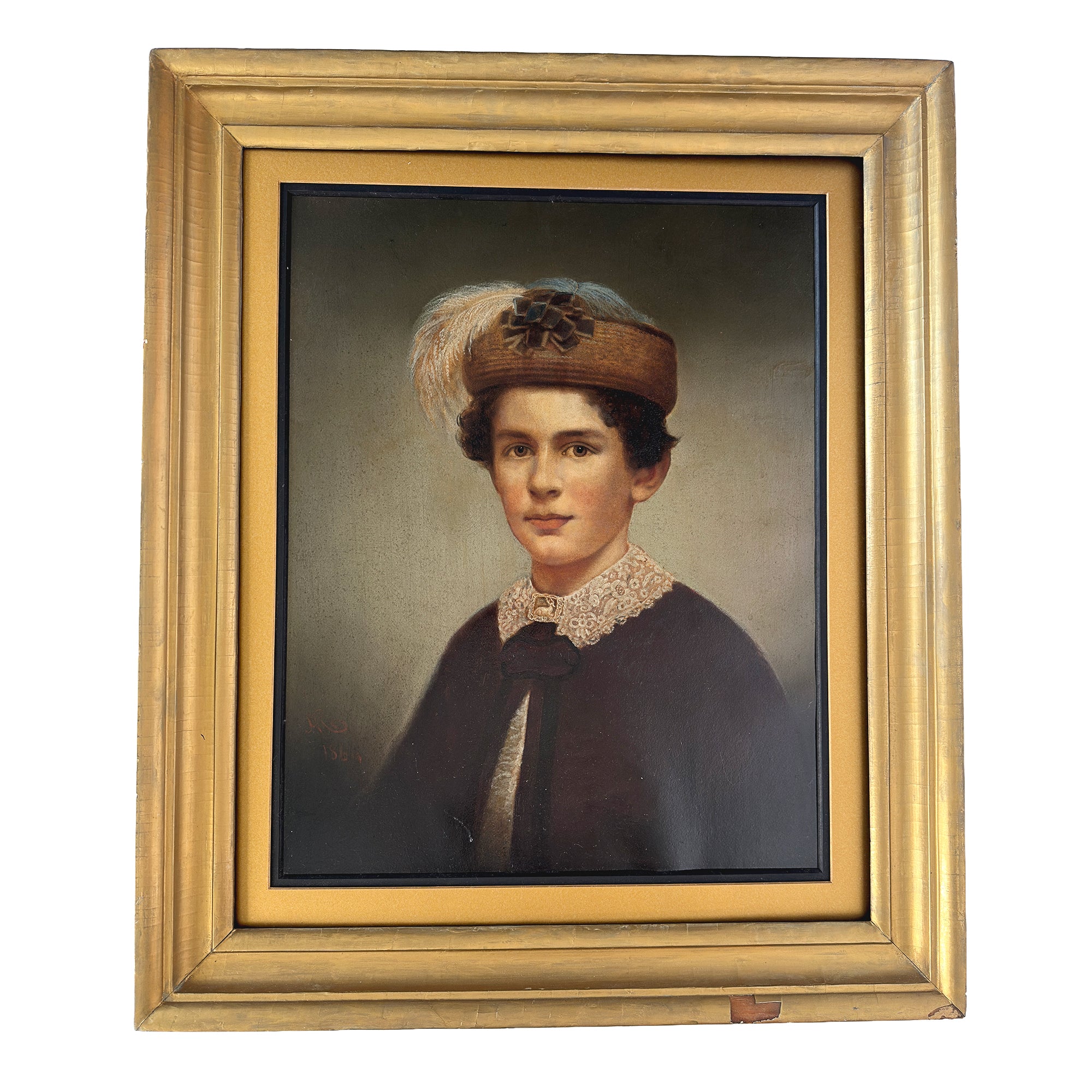 A refined and intimate oil on canvas portrait depicting a young sitter in mid-19th-century attire. The subject wears a feather-trimmed cap and lace collar fastened with a gilded clasp bearing an animal motif, painted with remarkable precision. Signed and dated 1864 lower left, the work exemplifies the academic portrait tradition of the period, blending realism with gentle romanticism.