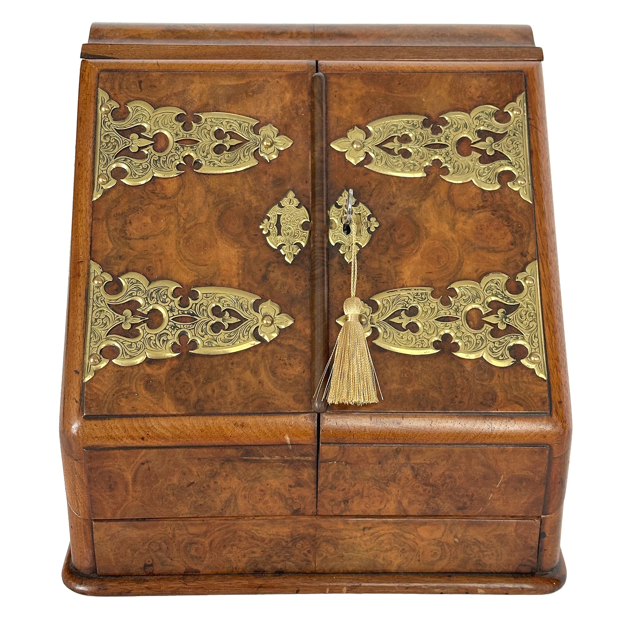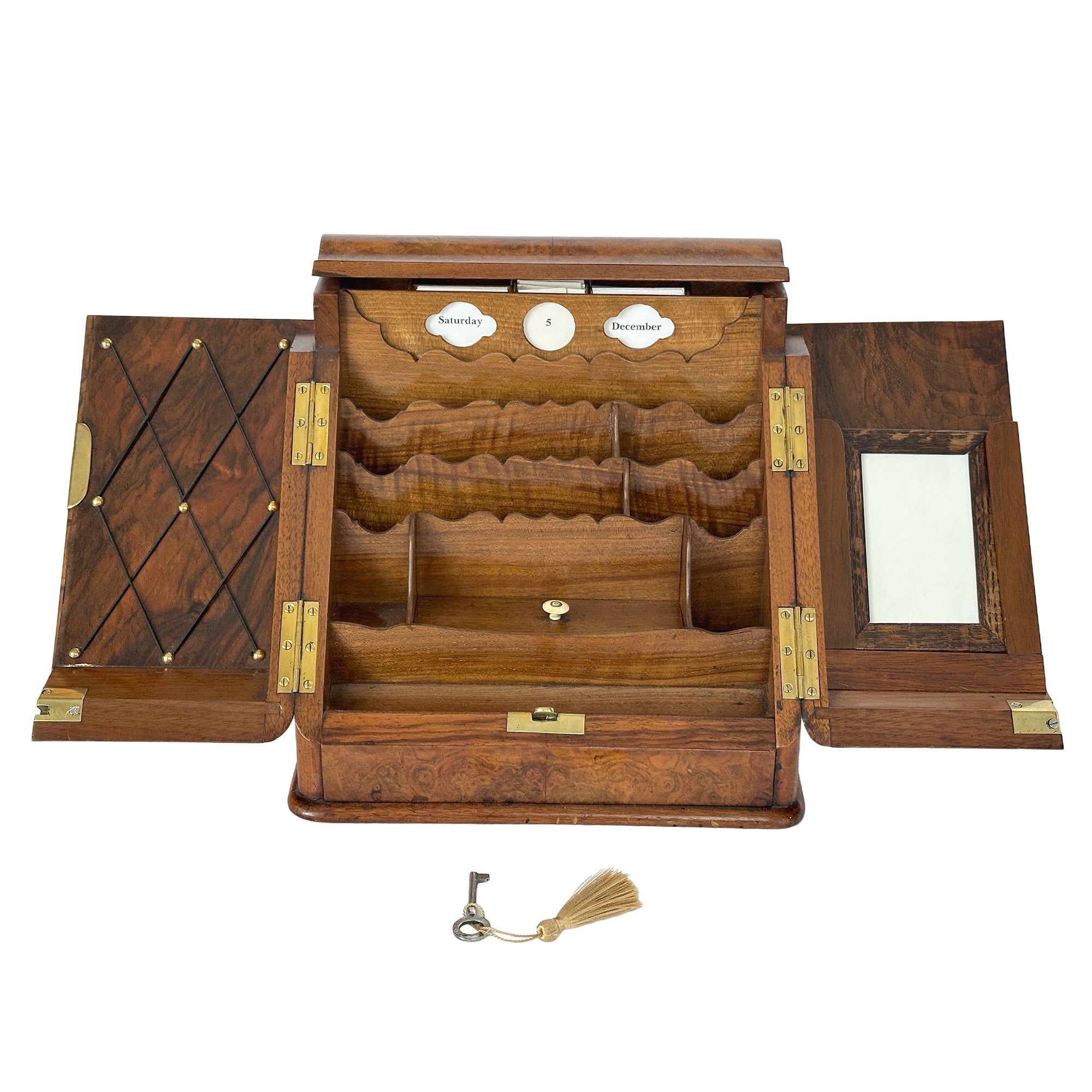 English Burr Walnut Table Cabinet / Correspondence Casket with Perpetual Calendar