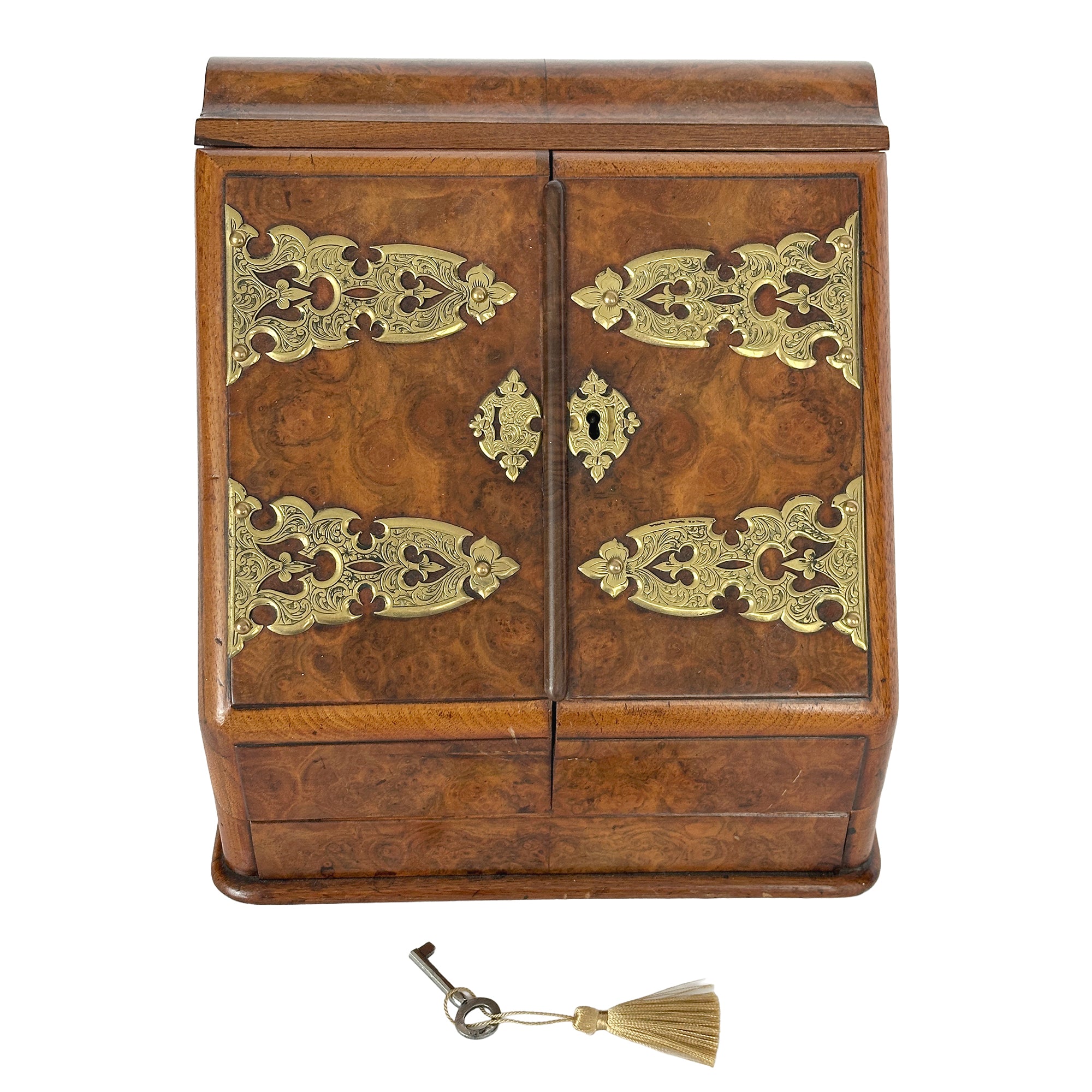 An exceptional mid 19th century English table cabinet, crafted in richly figured burr walnut and mounted with finely engraved gilt brass strapwork in Gothic and foliate forms. The exterior immediately reflects the quality of early Victorian craftsmanship, with carefully selected and bookmatched veneer creating a symmetrical, flame like pattern across the doors.