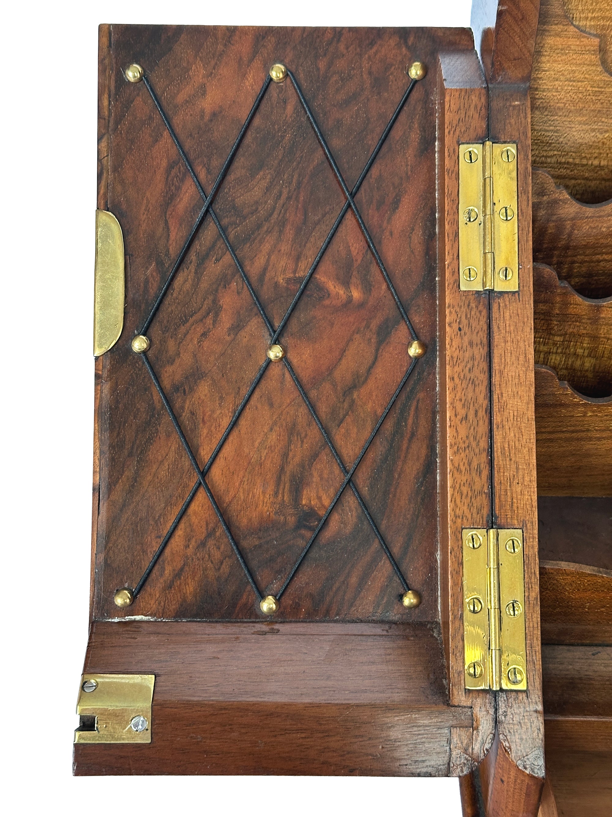 The interior doors add further depth and function. One side features a silk lined letter panel secured with brass studs, while the other includes a framed compartment, likely intended for a miniature portrait or personal keepsake. A lower drawer offers additional storage, completing a piece that is as practical as it is beautiful.