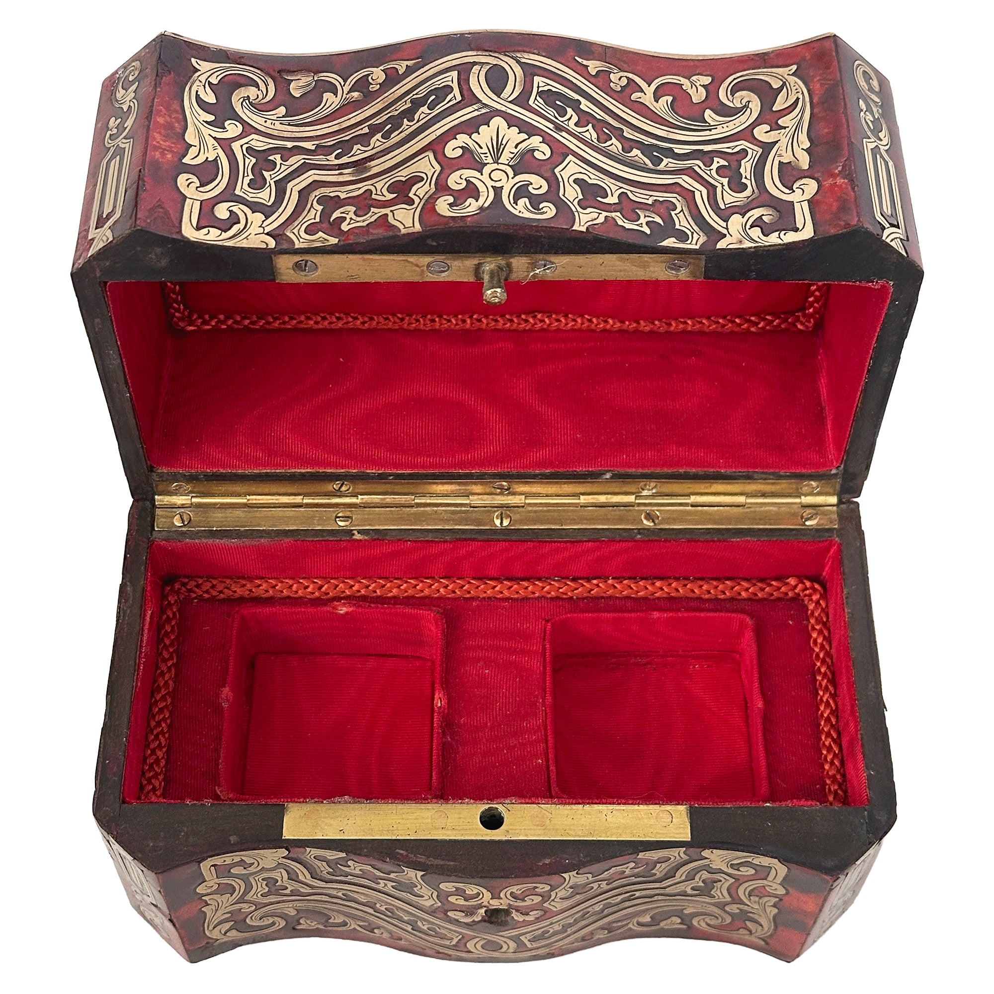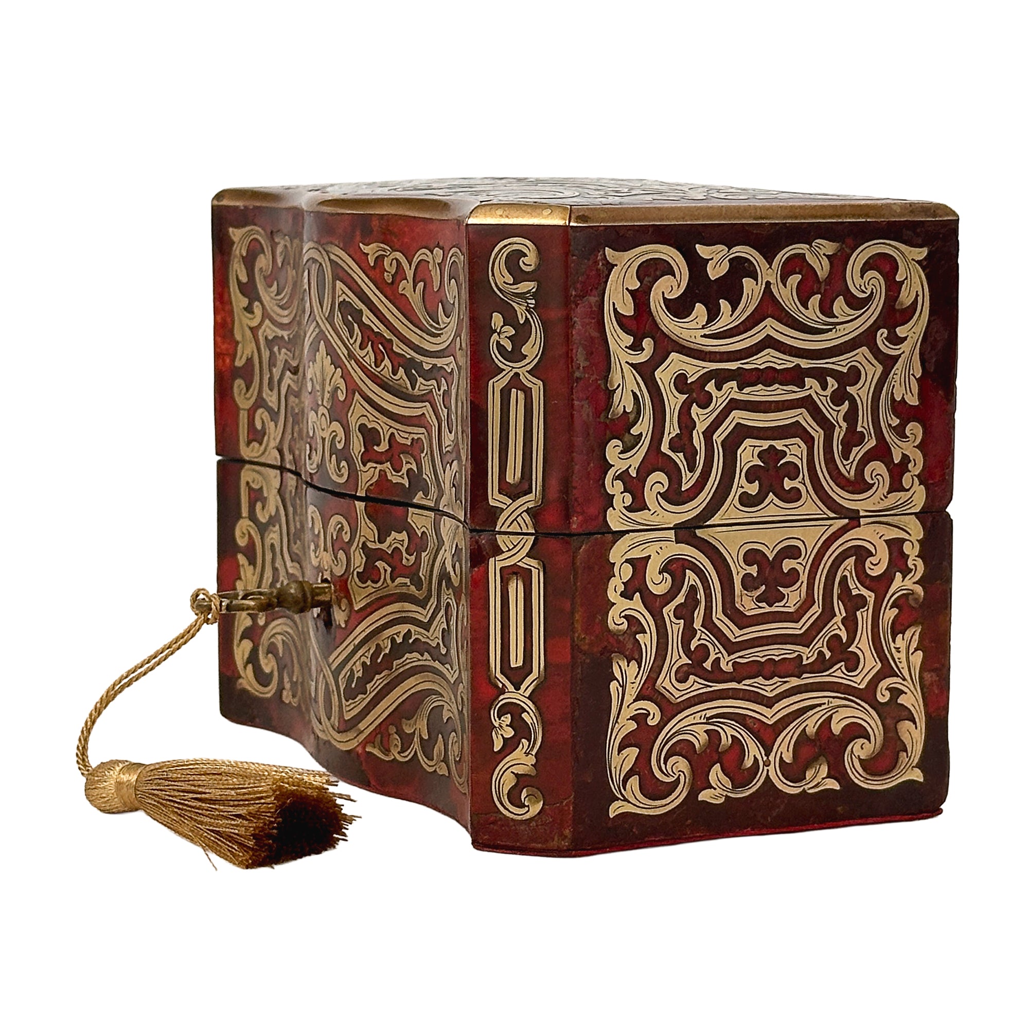 An exceptional Napoleon III period luxury perfume casket, richly decorated in the celebrated Boulle style with intricate gilt brass arabesque inlay set against deep red tortoiseshell effect panels. This type of elaborate marquetry, inspired by the work of André Charles Boulle at the court of Louis XIV, saw a dramatic revival in France during the mid nineteenth century and became synonymous with the opulence of the Second Empire under Napoleon III.
