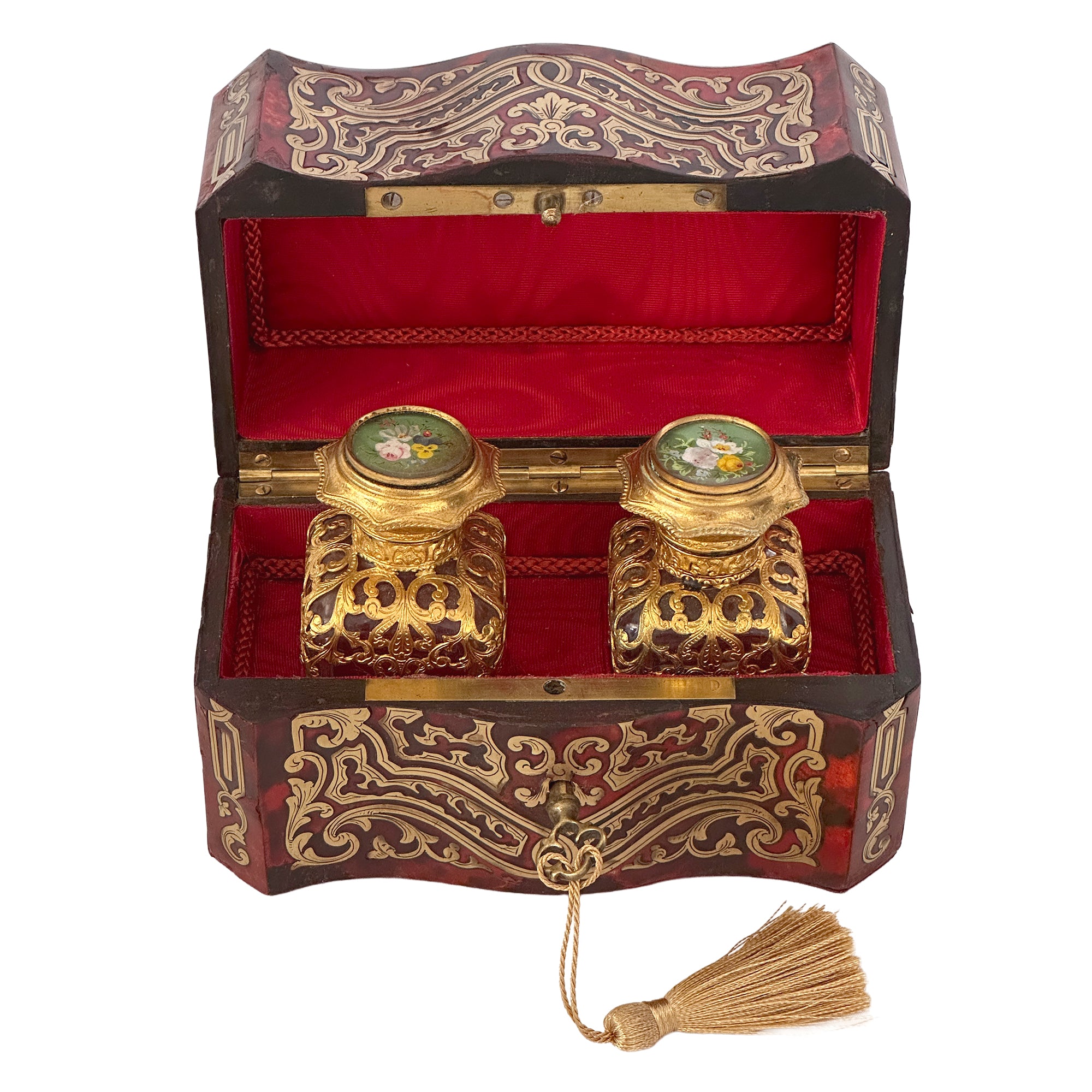 Napoleon III Boulle Style Double Perfume Casket with Enamel Bottles