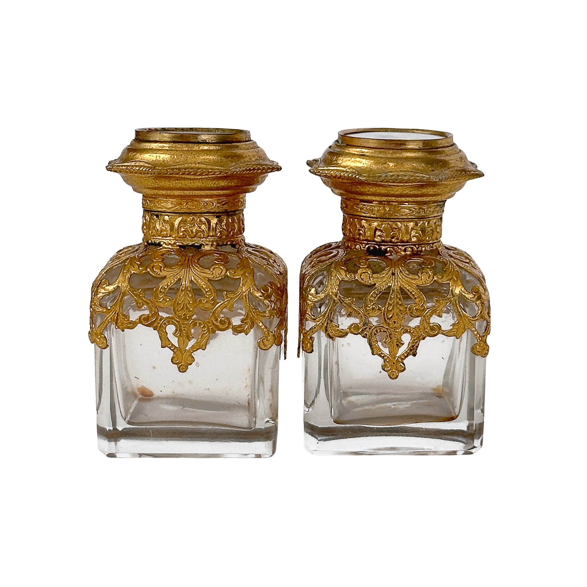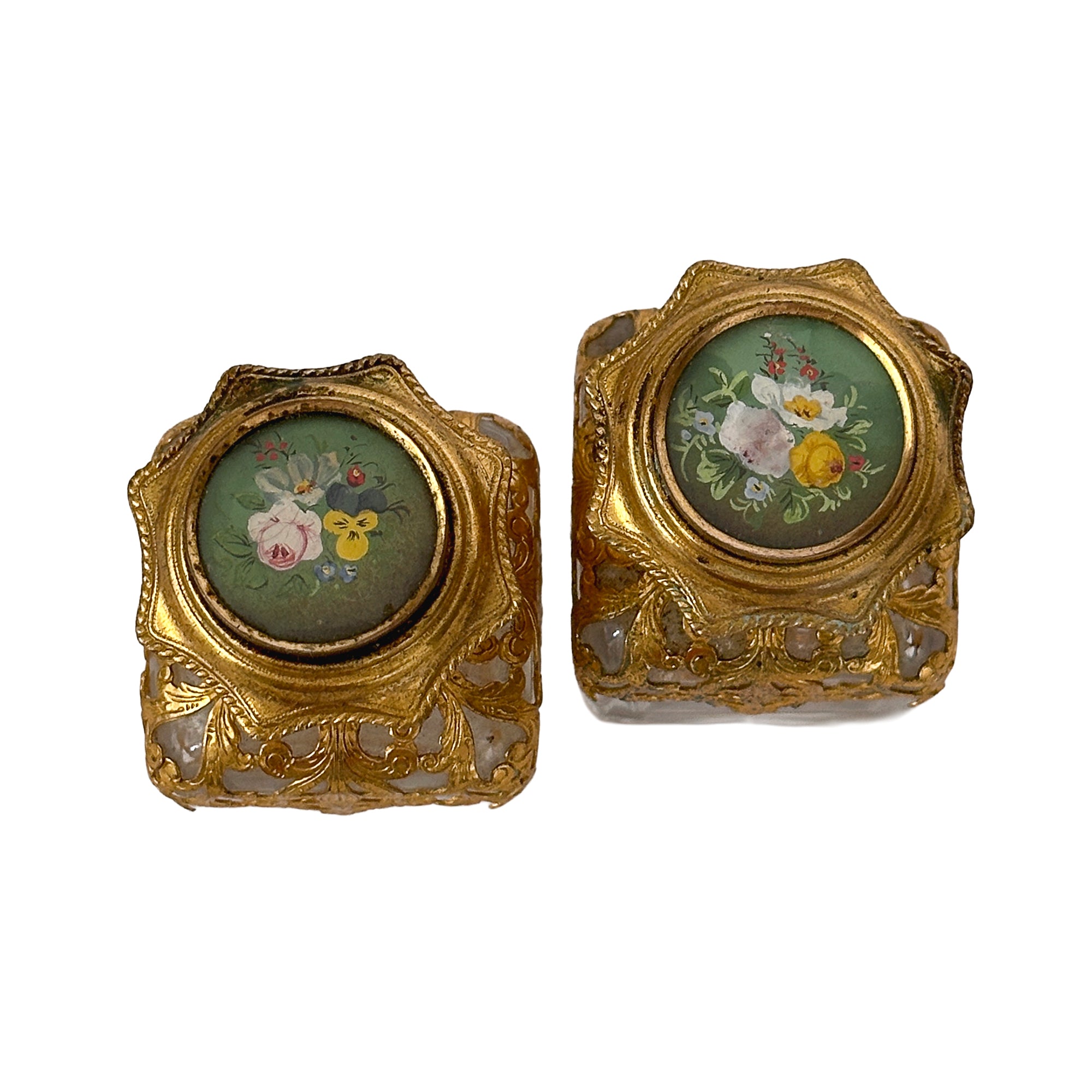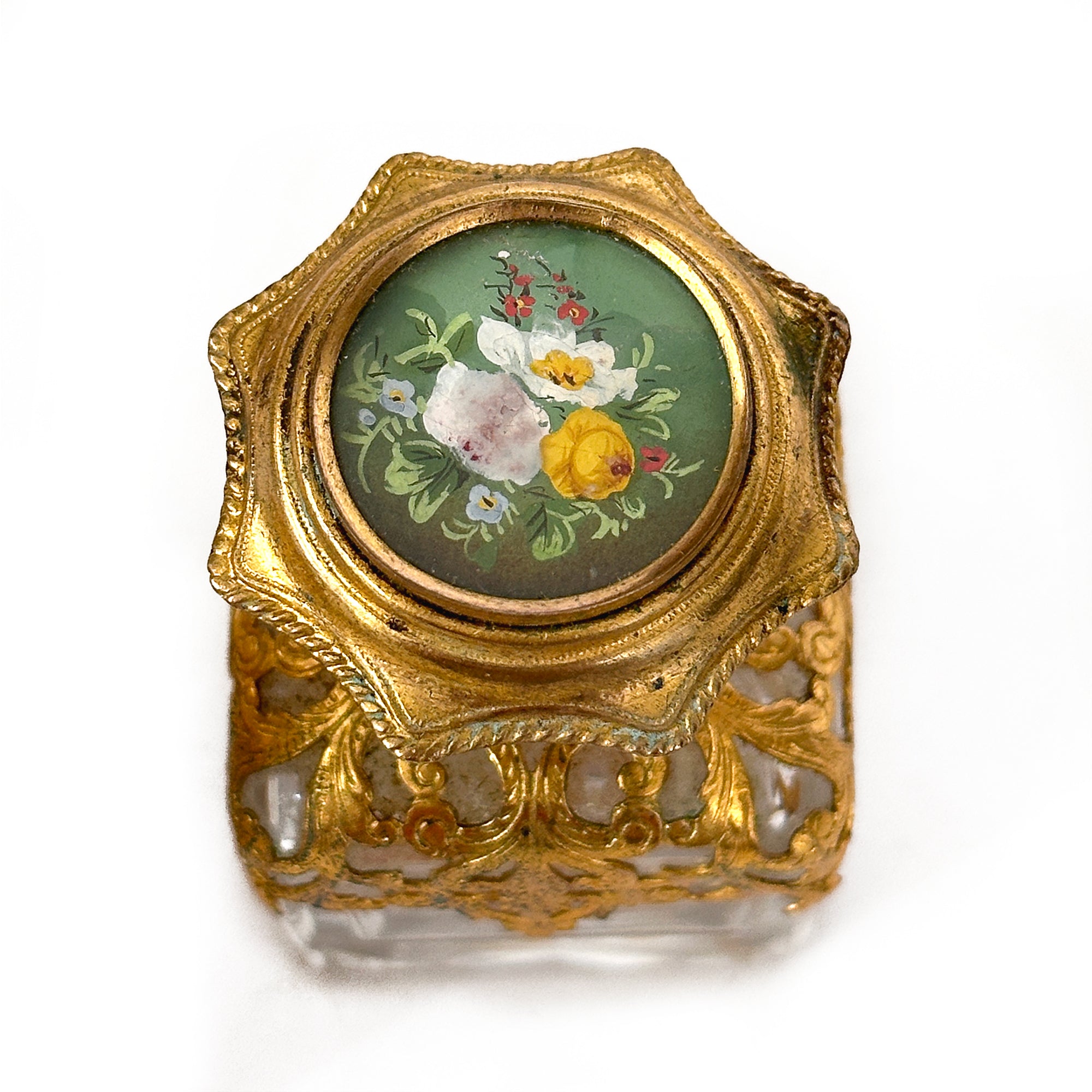 The bombe form casket opens to reveal a beautifully preserved crimson silk lined interior housing its original pair of heavy crystal scent bottles. Each bottle is adorned with ornate gilt metal mounts and fitted with finely painted enamel lids depicting delicate floral bouquets in the manner of nineteenth century Parisian luxury toiletry objects. The bottles themselves feature hand cut crystal bodies, designed to refract light and elevate the presentation of precious perfumes or essences.