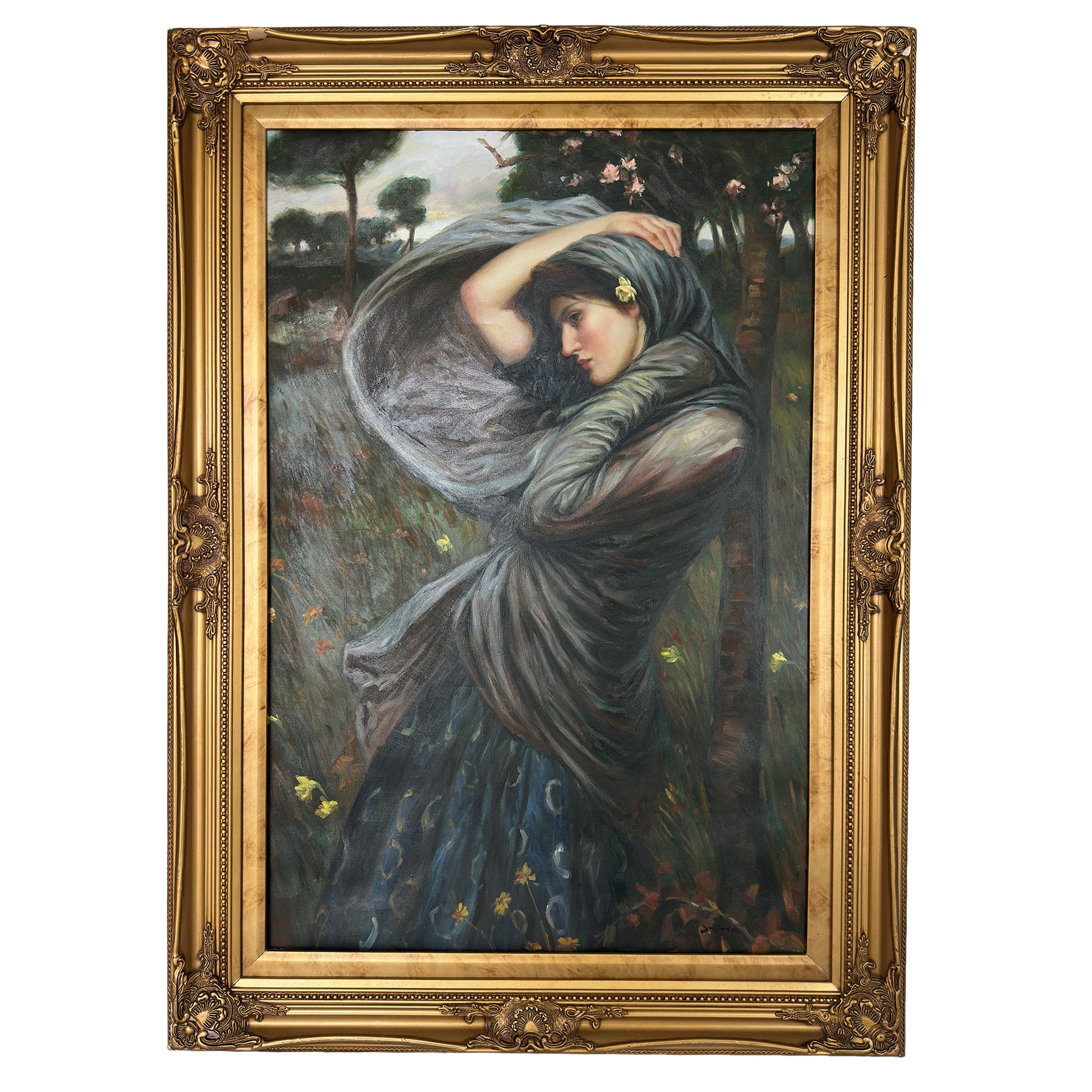 A beautifully executed large vintage oil on canvas after John William Waterhouse’s Boreas, one of the most iconic and emotionally charged compositions of the late Pre Raphaelite movement.