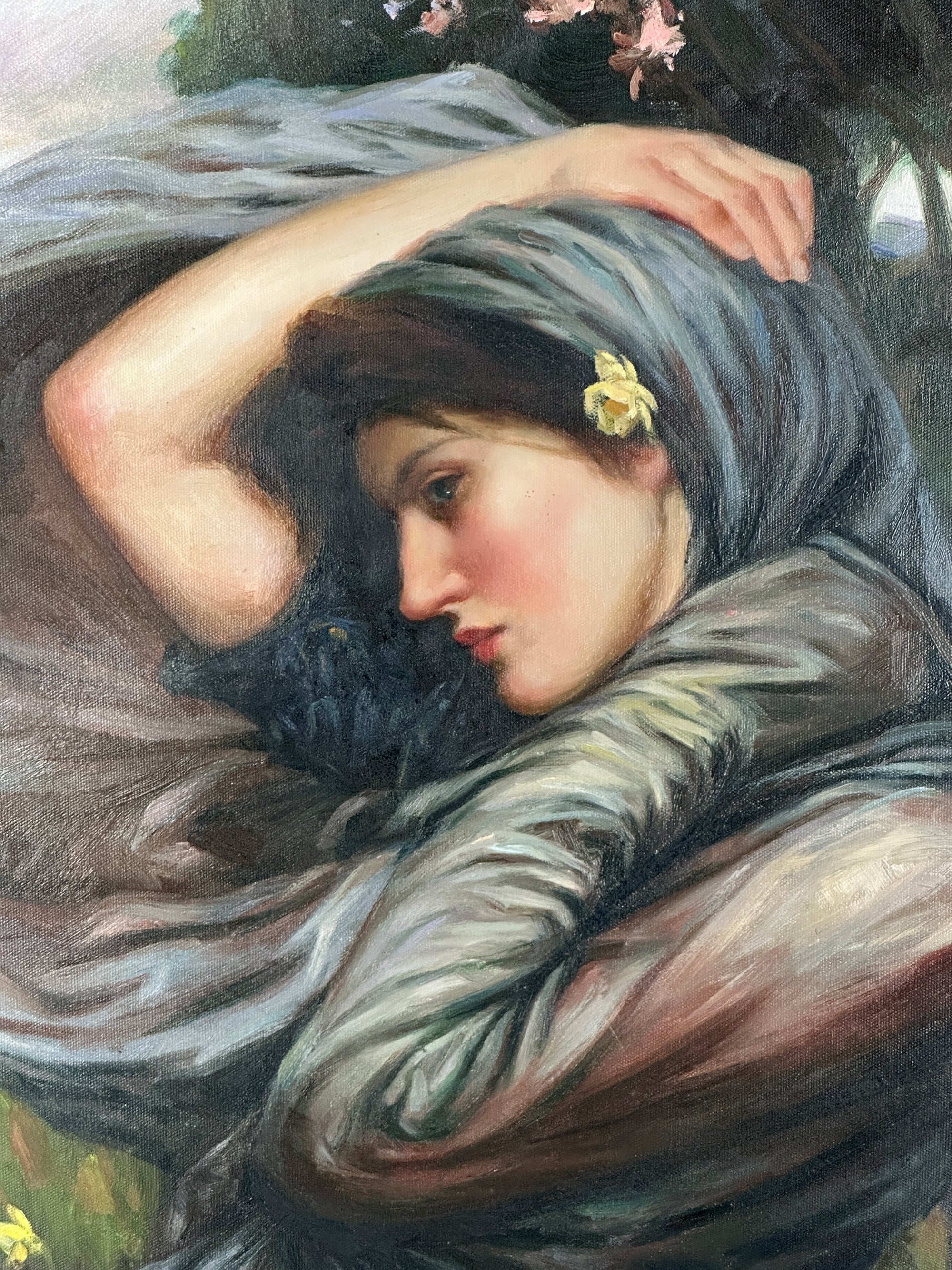 Waterhouse was known for blending myth, nature, and emotion seamlessly, and this image is a perfect example. The windswept figure set against a soft, blossoming landscape creates a striking contrast between delicacy and force, giving the painting a cinematic, almost dreamlike quality.