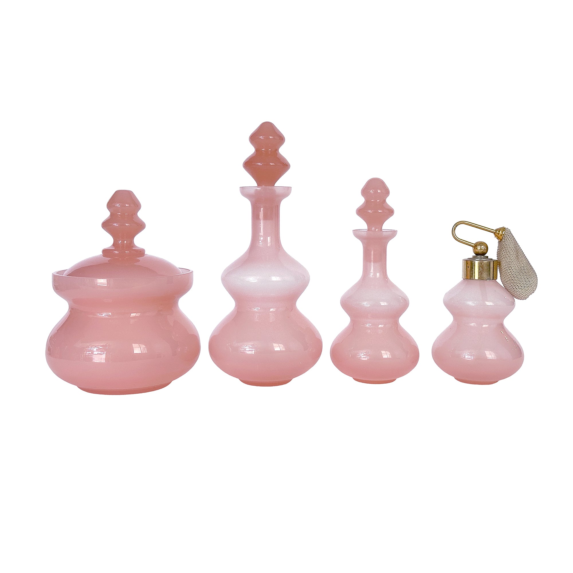 A rare and beautifully preserved mid 19th century French pink opaline vanity set, comprising four matching pieces in classic baluster and lidded jar forms. Originally used for perfume, powder, and dressing table essentials, sets like this were staples of refined Second Empire interiors.