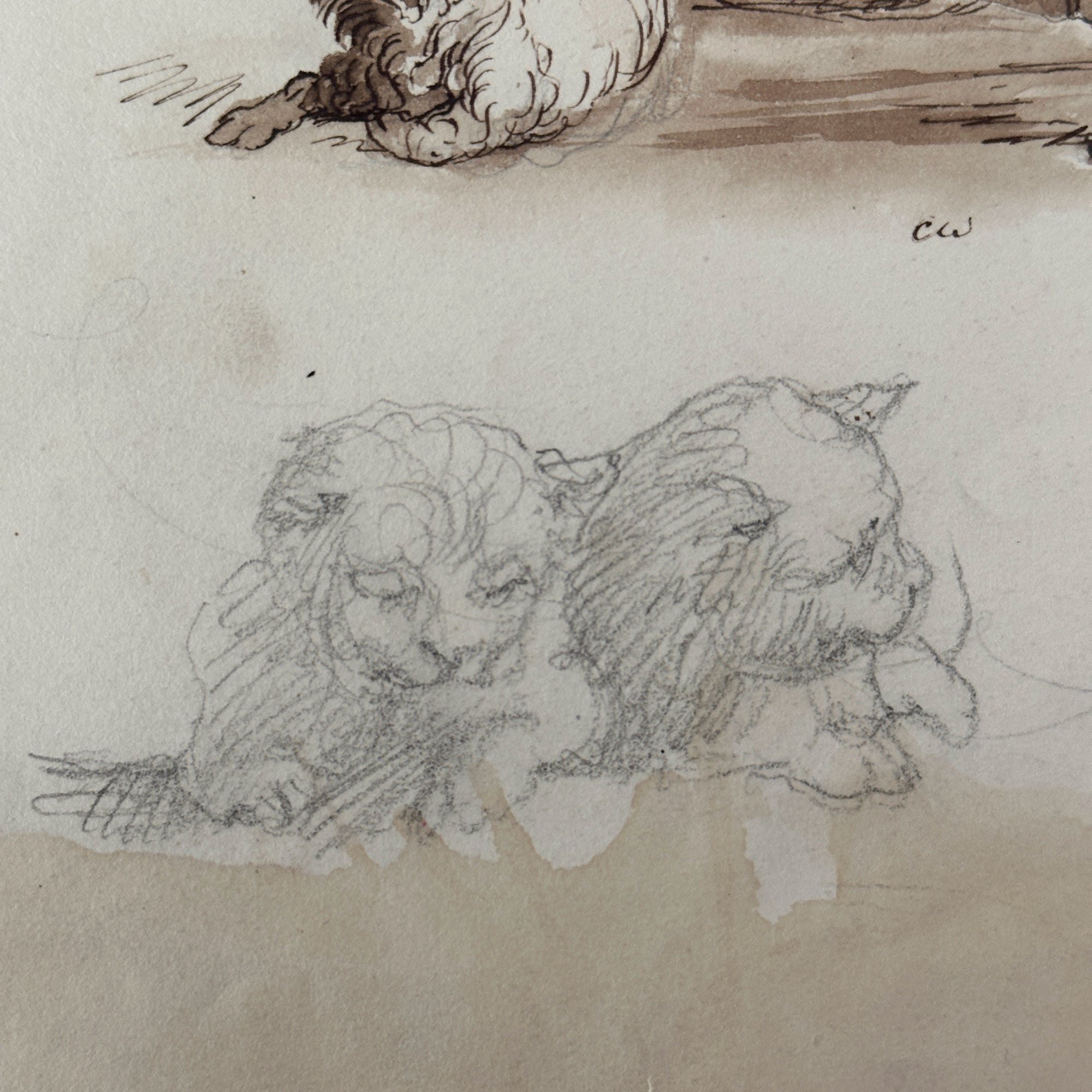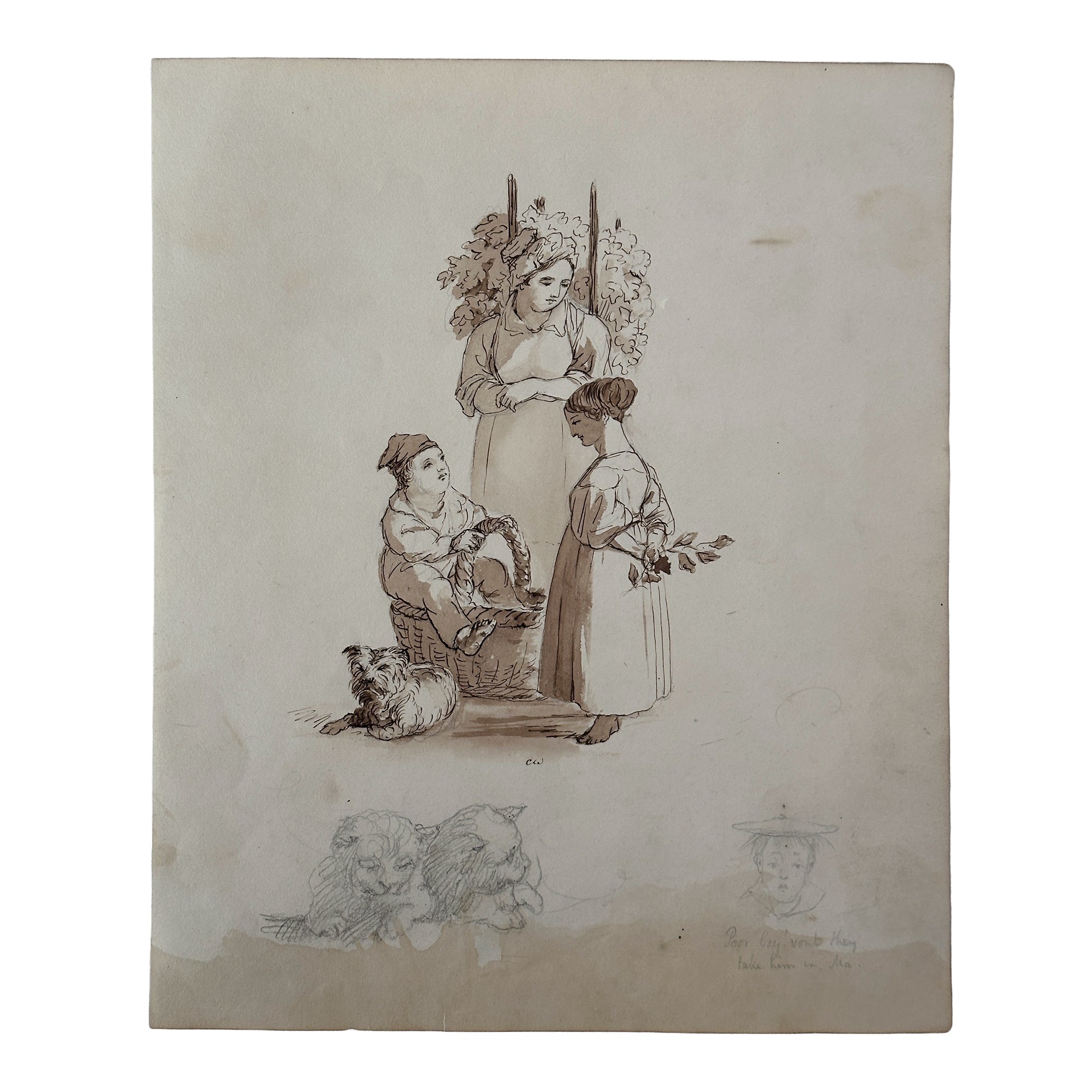A beautifully intimate and expressive 19th century study sheet, executed in ink and sepia wash, likely once part of an artist’s working portfolio or sketchbook. This is not a formal finished work, but something far more personal, a glimpse into the artist’s process, observation, and narrative development.