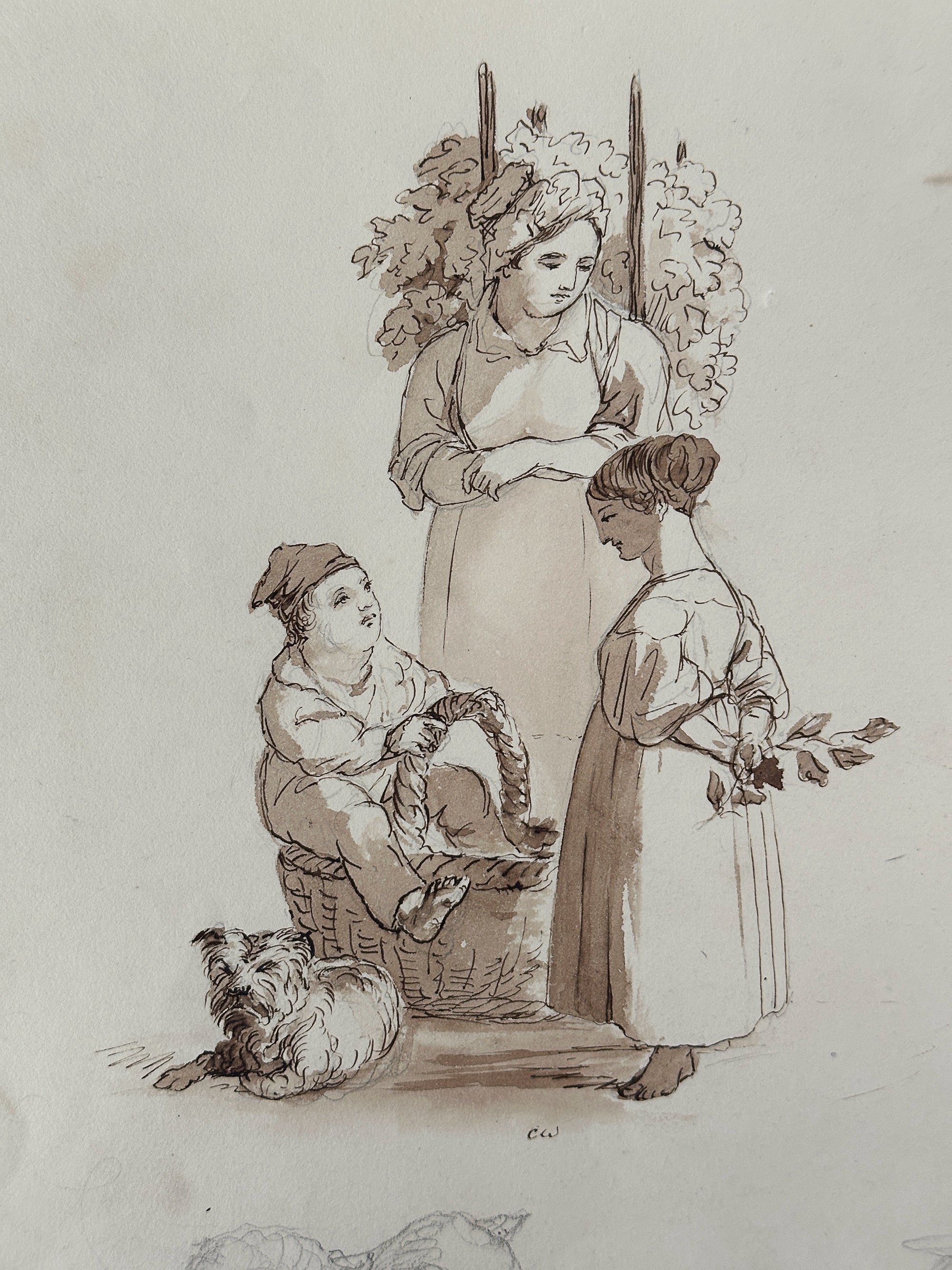 The central composition depicts a tender domestic scene, with a seated child in a basket, a young girl holding flowers just behind her back, and a maternal figure above them framed by foliage. At their feet, a small dog rests, rendered with quick, confident strokes. The figures carry a softness and sentimentality characteristic of early to mid 19th century European genre studies, where everyday life was observed and quietly romanticized.
