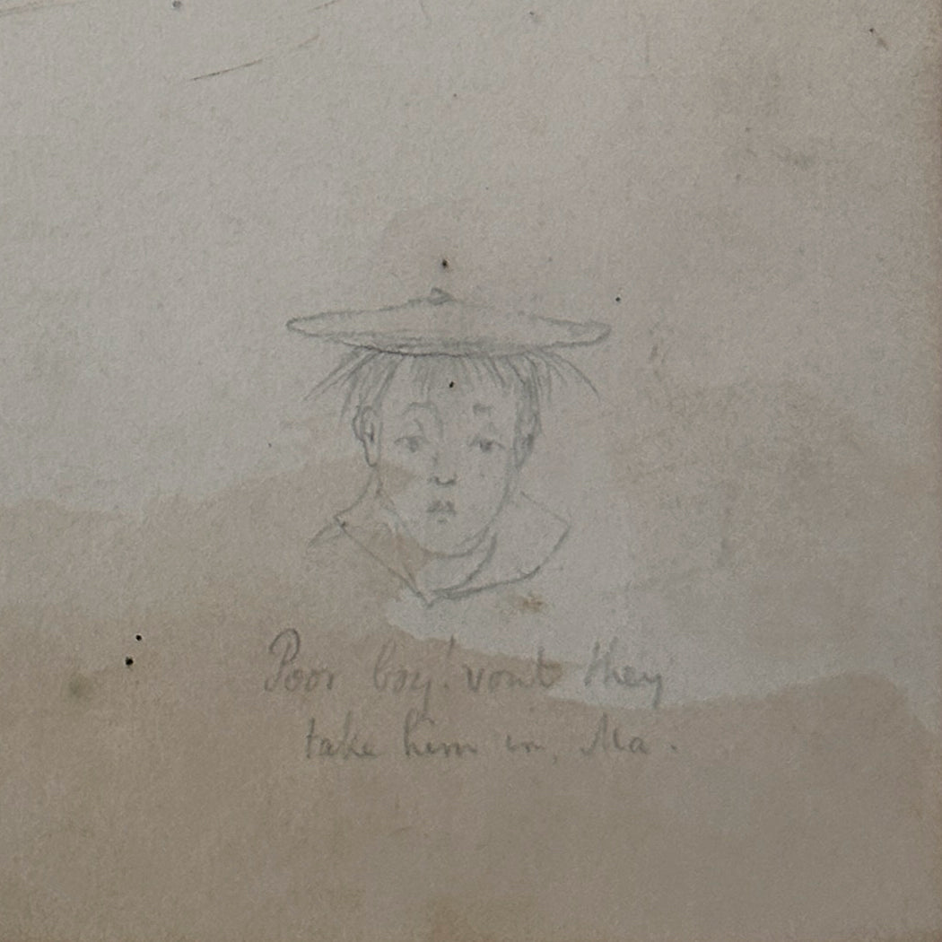 What makes this piece especially compelling is the presence of multiple secondary sketches across the sheet. Along the lower edge are studies of animals, likely exploratory drawings refining movement and form. To the side, a small portrait of a child in a wide hat appears, accompanied by a faint handwritten note, adding an emotional and narrative layer to the work.